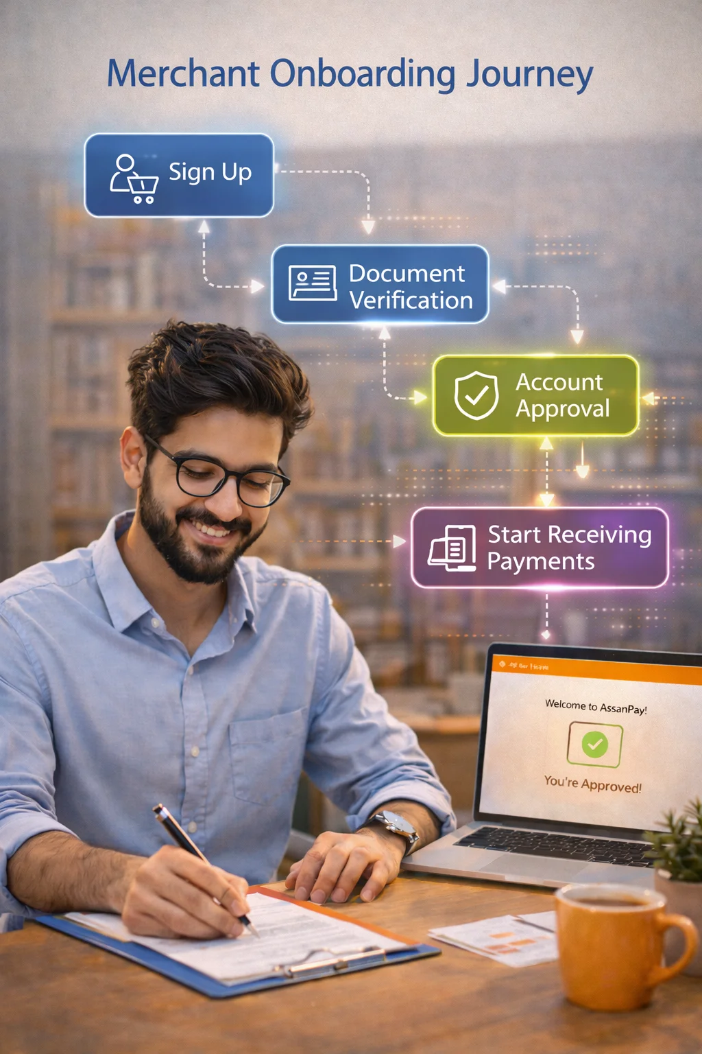 It’s a quick and easy way to open a merchant account with AssanPay. No complex documents and no long waiting times. Simply sign up and register your business, and your account will be ready.